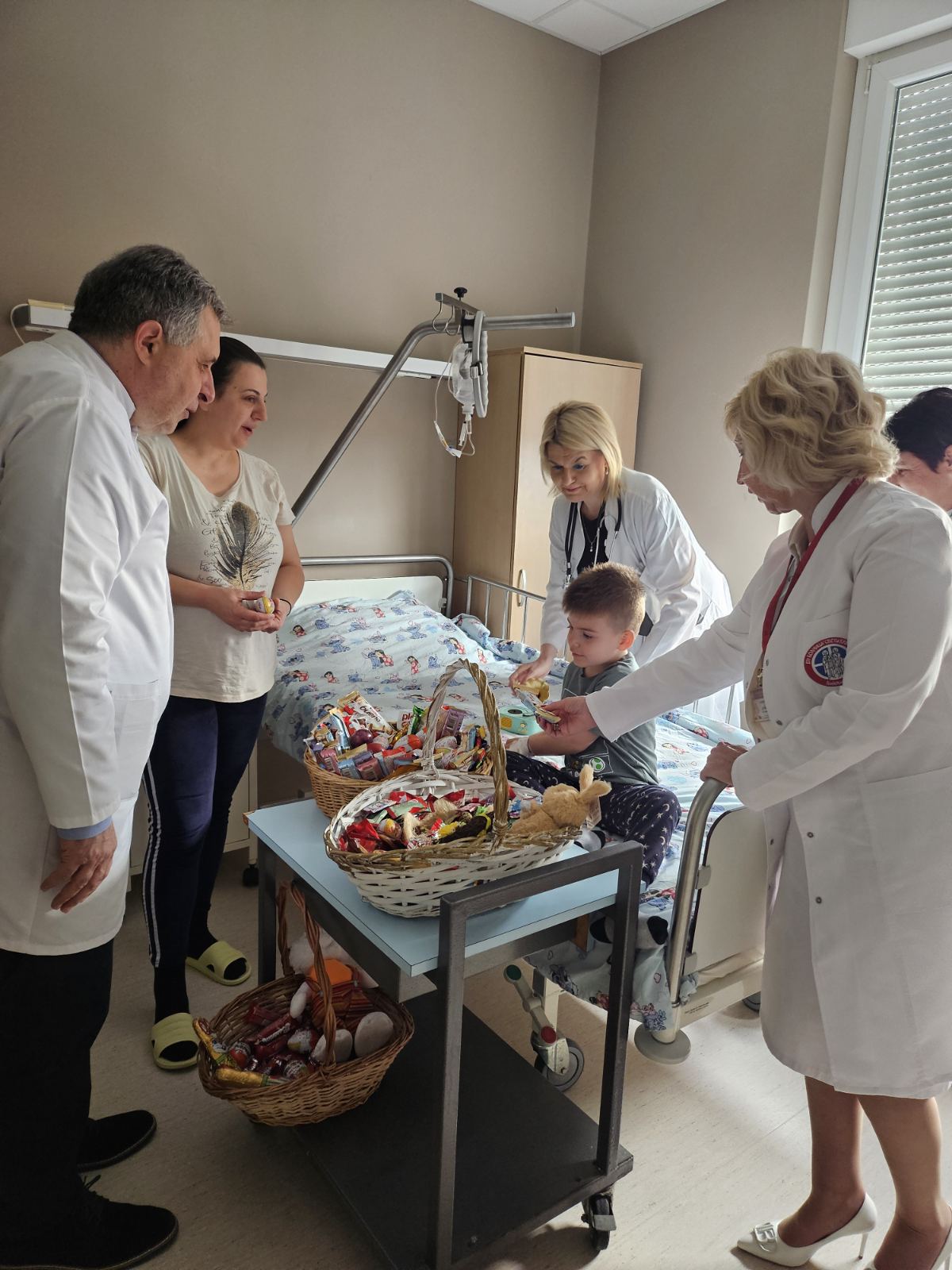 Direktor JZU Bolnica „Sveti Vračevi“, prim. dr Mikajlo Lazić, zajedno sa prim. dr Nelom Mitrović i načelnicom Odjeljenja za pedijatriju prim. dr Ružicom Borović obišao je na vaskršnje jutro najmlađe pacijente.