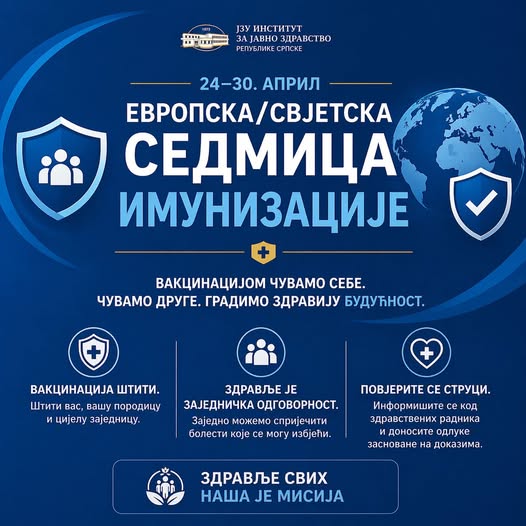 Јуче је у Источном Сарајеву, у организацији ЈЗУ Института за јавно здравство Републике Српске, обиљежена Европска и Свјетска седмица имунизације (24-30. априла), уз подршку канцеларије УНИЦЕФ-а у БиХ и канцеларије Свјетске здравствене организације у БиХ, са циљем да се промовише имунизација као кључна мјера за превенцију болести и заштиту живота.